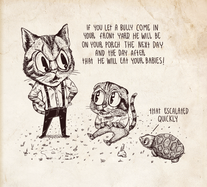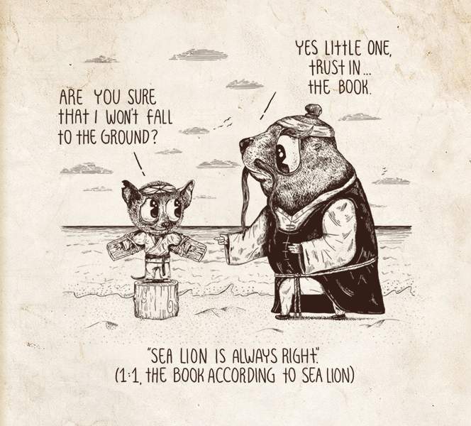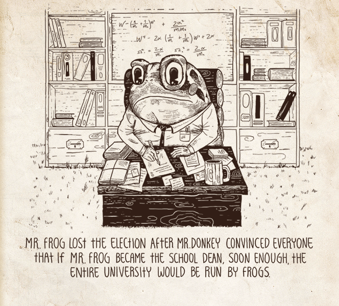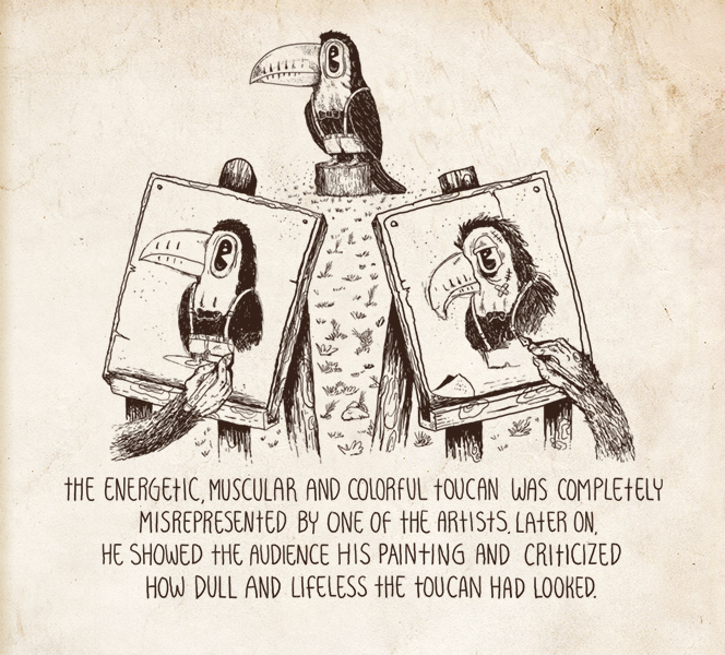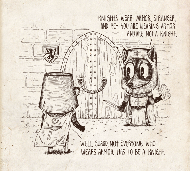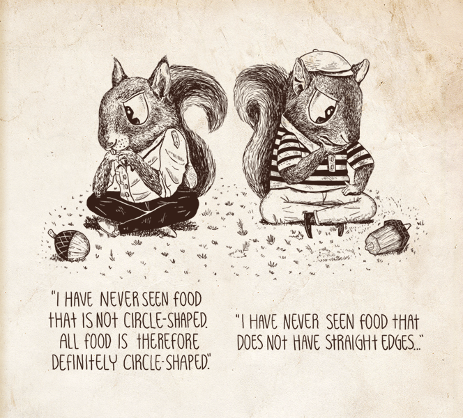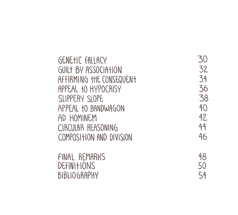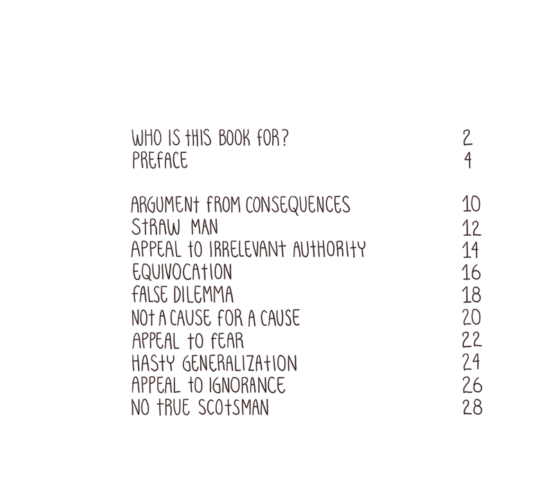 さらに、この本の新しいところは、今日の対話の中で多く見られる推論の誤りを説明するために、生きいきとしたイラストがつけられているところである。これらのイラストは、オーウェルの『動物農場』(Animal Farm)のような寓話や、ルイス・キャロルの物語や詩のようなユーモアあふれるナンセンス作品にヒントを得て描かれている。イラスト同士に物語的なつながりはない。同じスタイルと主題は貫かれているものの、それぞれ別のシーンである。その方が、応用が利くし、再利用もしやすいだろう。それぞれの誤謬は1ページで説明されているから、読者も内容を理解し、覚えることが容易だろう。