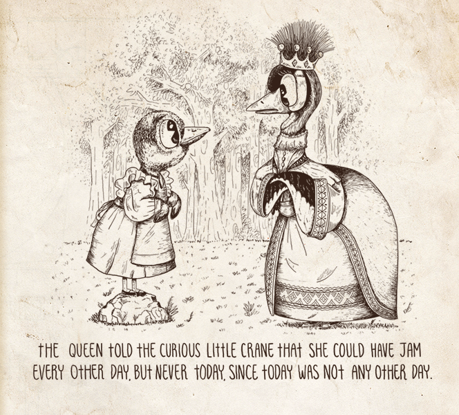 2 このイラストは、ルイス・キャロルの『鏡の国のアリス』での、アリスと白の女王のやりとりに基づいている。