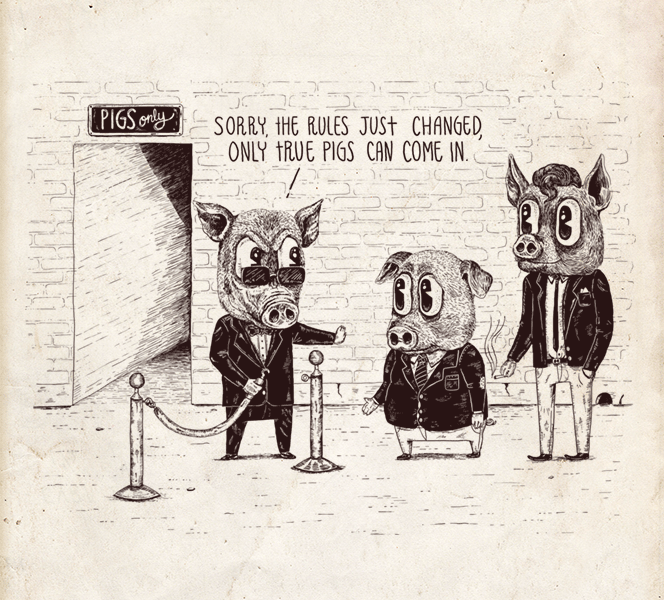 たとえば、プログラマーは社会的スキルを持たない生き物だと断定した人がいたとしよう。誰かが、「でも、ジョンはプログラマーだけど、社会的なスキルを立派に持っているよ」と言って、その主張を否定する。そうすると、最初に主張した人は、次のような応答を返すかもしれない。「そうだね。でも、ジョンは真のプログラマーとは言えないから」。ここでは、プログラマーとは、いったいどんな属性を持つ者なのか、明らかになっていない。ここでいう「プログラマー」は、たとえば、「青い目の人」ほどには明確に定義されたカテゴリーではない。この曖昧さのおかげで、頑固な頭の持ち主は、好きなように定義を変えることができるのである。