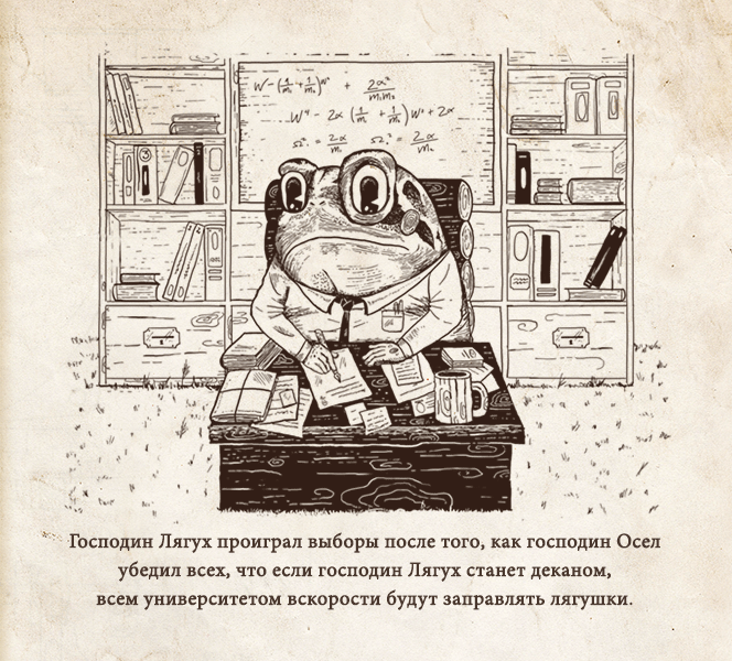 Картинки отчасти вдохновлены аллегориями вроде «Скотного двора» Оруэлла, отчасти – веселым нонсенсом сказок и стихотворений Льюиса Кэрролла. В отличие от этих работ в нашей книге нет связного повествования: каждая история – отдельная сценка, и связаны они между собой лишь стилем и темой; так их можно лучше приспосабливать и применять к той или иной конкретной ситуации. Каждой ошибке посвящен один разворот, отсюда и немногословность.